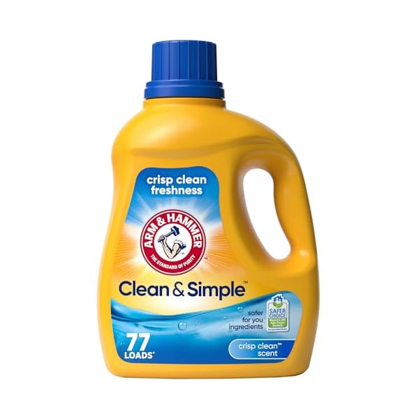 ARM & HAMMER Clean & Simple, 77 Loads Liquid Laundry Detergent is a concentrated, dye-free formula with 3X powerful stain fighters that delivers a deep, effective clean using fewer ingredients and less water. It is safe for all machines, works well in cold water, and meets EPA Safer Choice standards, making it safer for people, pets, and the planet. Users appreciate its gentle scent, effectiveness on stains, and suitability for sensitive skin, though some have experienced shipping issues.
