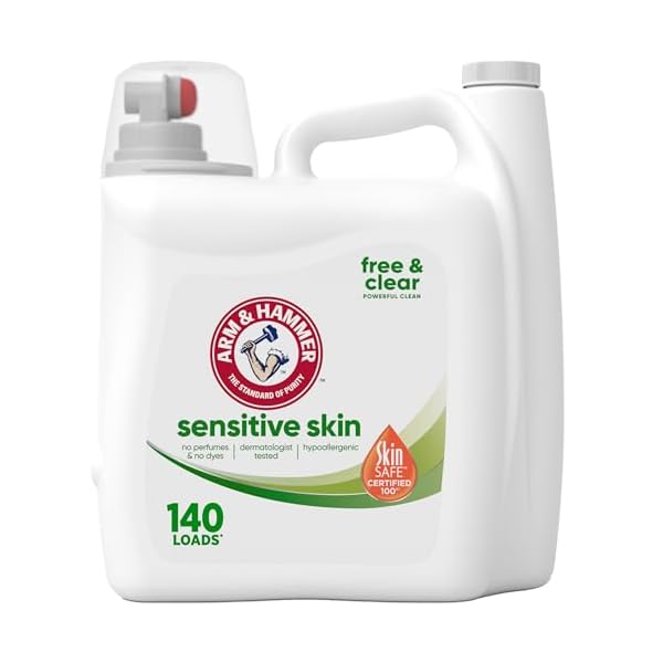 ARM & HAMMER Sensitive Skin Free & Clear Liquid Laundry Detergent is a dermatologist-tested, hypoallergenic formula designed for sensitive skin, free from dyes, fragrances, and preservatives, and certified by SkinSAFE. It effectively cleans 140 medium loads with concentrated stain fighters, while being gentle enough for everyday and baby clothes, even in cold water, and works with both standard and HE machines. Customers praise its thorough cleaning, odor removal, softness, and skin-friendliness, making it a reliable choice for those with allergies or sensitivities.