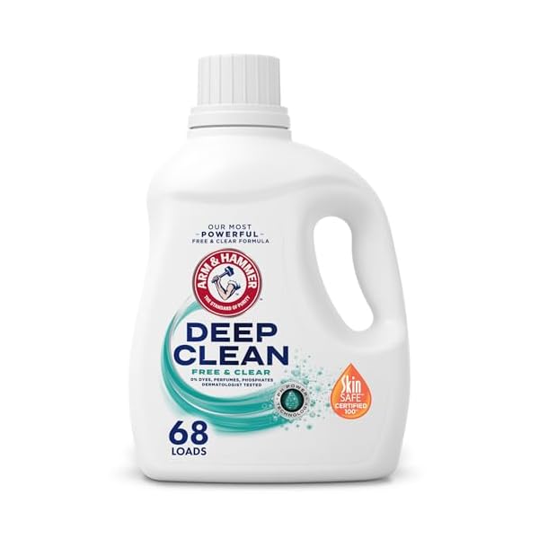 ARM & HAMMER Deep Clean Free & Clear Liquid Laundry Detergent is a fragrance-free, dye-free formula designed for sensitive skin, providing a deep clean that effectively removes tough stains and odors with 4X the stain fighters per dose. The dermatologist-tested and SkinSAFE-certified detergent is gentle yet powerful, suitable for all wash temperatures and machine types, including high-efficiency models, and is made using renewable energy in eco-friendly packaging. Customers appreciate its effectiveness on delicate skin, absence of harsh chemicals, long-lasting performance, and affordability, though some note a slight unpleasant smell upon opening that dissipates after washing.