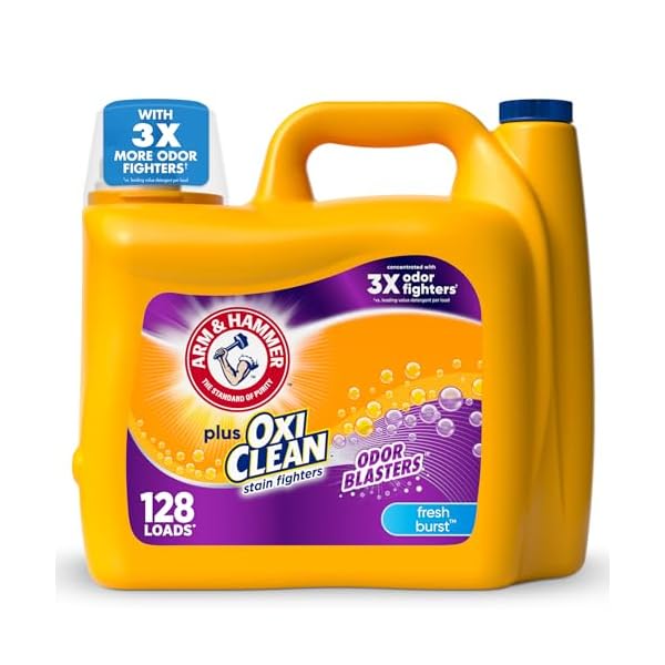 ARM & HAMMER Plus OxiClean Odor Blasters Fresh Burst is a concentrated liquid laundry detergent that cleans up to 128 loads with powerful stain and odor removal, thanks to OxiClean Stain Fighters and Odor Blasters. Users praise its ability to eliminate tough odors, especially sweat and mildew, while leaving clothes with a lasting, pleasant scent, making it ideal for heavy or smelly loads. However, some note that it may not leave clothes as soft as desired and is not suitable for those with sensitive skin due to its strength.